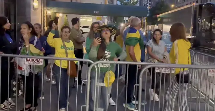 Em frente à residência oficial do representante do Brasil na ONU, onde Lula e a primeira-dama Rosângela da Silva, a Janja, ficarão hospedados, manifestantes se reuniram vestidos com camisetas verde e amarelas e símbolos de apoio ao ex-presidente Jair Bolsonaro. O grupo carregava bandeiras nacionais e entoava palavras de ordem como “Lula ladrão” e frases em apoio ao ex-presidente dos Estados Unidos, Donald Trump.